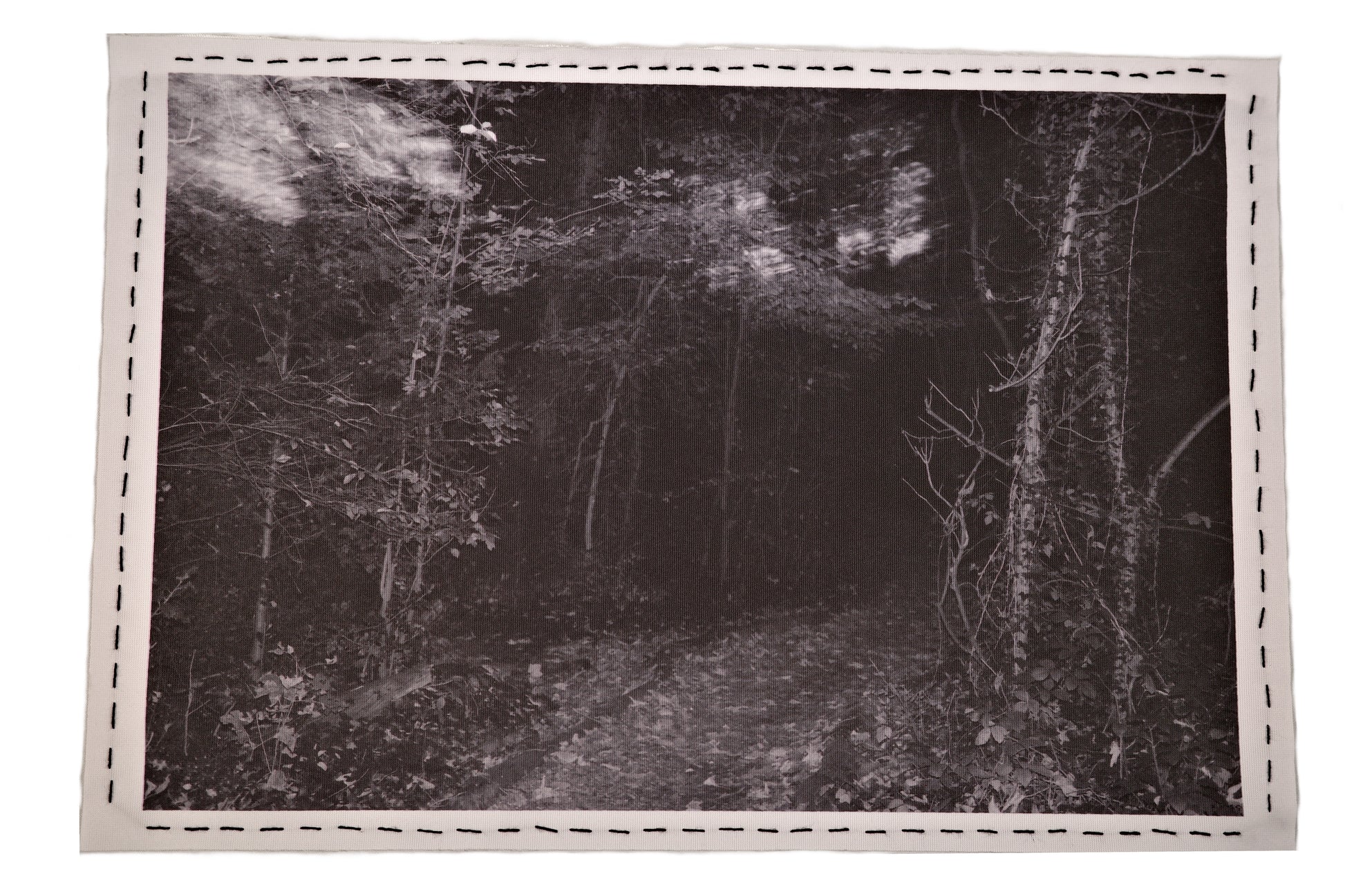 Photography on linen with sashiko border and custom 3D-printed hanging system